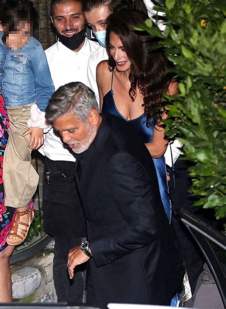 During their family vacation to Villa Oleandra, Amal and George enjoyed a romantic dinner at Il Gatto Nero. Amal was radiant as always. Wearing a glossy midnight blue dress with spaghetti straps, she had the perfect arm candy – her husband, George Clooney. To accompany her glam look, Amal wore her hair down with a deep side part with loose curls. Her make-up was simple, yet perfect! Natural to light blush with a rosy lip. Linked arm in arm, George, 60, opted for a black tux and showcased his perfectly trimmed silver beard for the occasion.