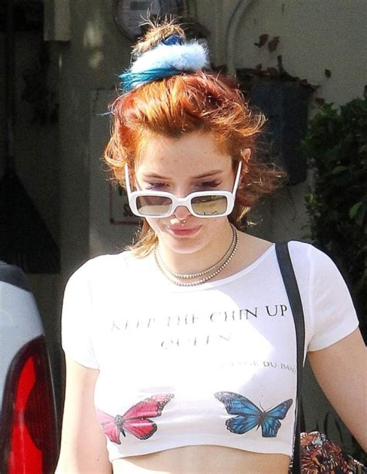 Bella Thorne stepped out in Los Angeles on Oct. 19, 2017 with a fuzzy scrunchie in her hair. It looked cute with her butterfly crop top and white sunglasses.