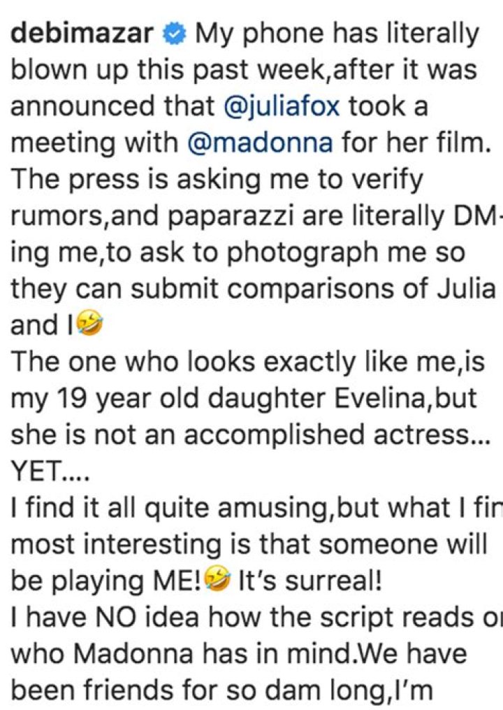 Debi explained that even though she’d only interviewed Julia once, she thought that she was “gorgeous, smart and a very talented actress.” The Goodfellas actress likened her more to her pal, but she said it was an honor to be a part of the movie. She also offered advice to whoever gets cast as her. “Funny enough, she reminds me more of Madonna when we were young, then of myself! I’d obviously be flattered.I wish the best to all the gals who audition! If you need dance moves or accent coaching ,gimme a ring,” she said.