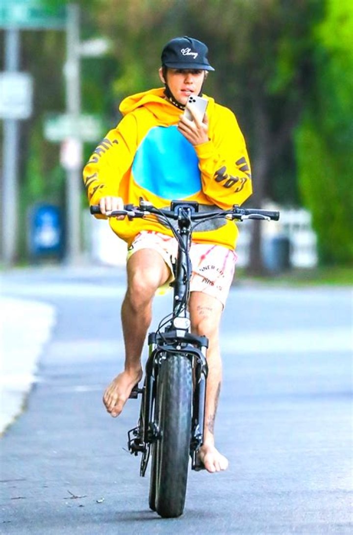 Justin Bieber took a break from quarantine to go for a barefoot bike ride in Beverly Hills. The “Sorry” hitmaker touched down in California on May 21 after a lengthy lockdown in Canada with his wife Hailey Baldwin, 23, and hit the streets in a bright yellow hoodie as he zoomed around on his motorized bike. The 26-year-old wore a Drew-branded face mask, which he pulled down below his chin as he chatted to someone on the phone. He also paired his hoodie, which read ‘That’s On God! Jesus Is King’, with a black baseball cap and tie-dye shorts.