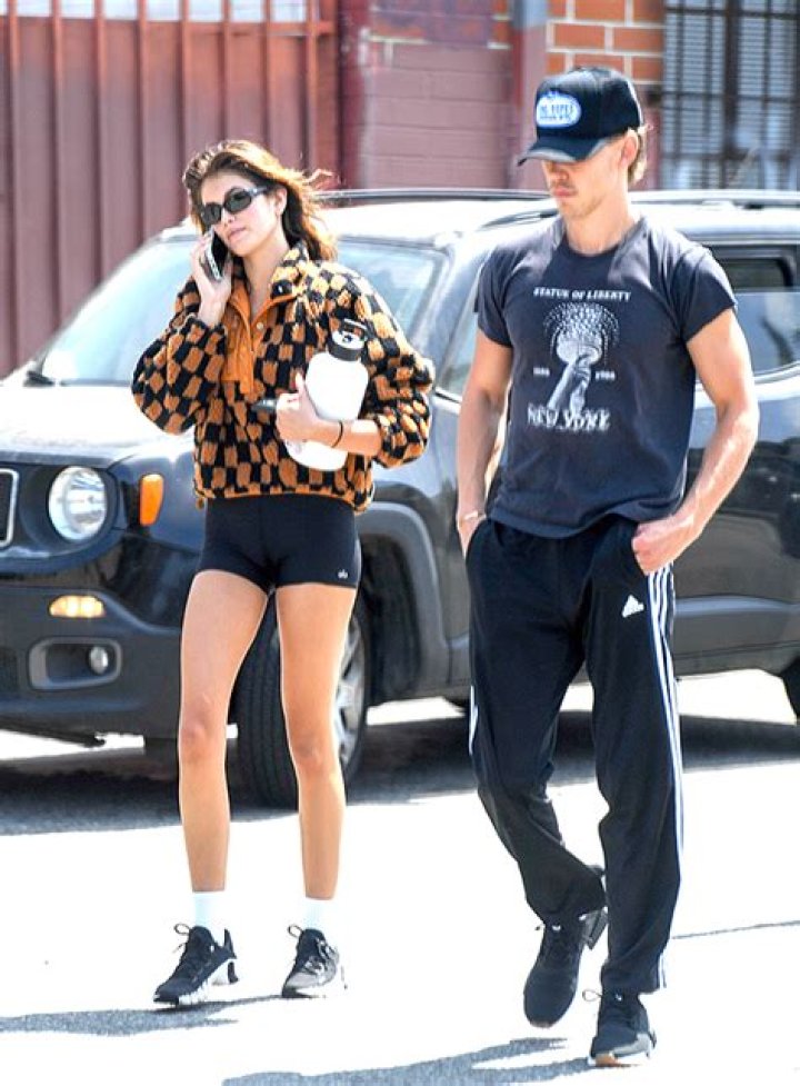 Kaia Gerber was spotted leaving the gym in Los Angeles on Wednesday, flaunting her toned legs in some short, black alo bike shorts. The 20-year-old model, who also rocked an orange-and-black-checkered fleece shacket, was joined by her beau, Austin Butler, for the occasion. The 30-year-old actor went casual-cool for the outing, wearing signature black adidas track pants, a black tee with a white graphic design and a black baseball cap also with a white design.