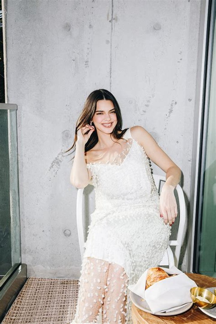 Perhaps our favorite photo of Kendall was her head-to-toe sheer blue ensemble. She was pictured lying on a bed wearing a sheer, high-waisted royal blue stockings with a pair of pointed-toe metallic silver pumps. She styled the stockings with a long-sleeve, sparkly sheer top and no bra underneath, covering her bare chest with just her arm.