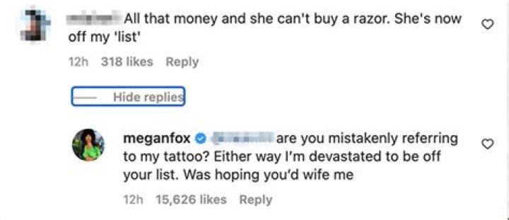 Megan began her response by correcting the person on what he thought was hair was actually ink. “are you mistakenly referring to my tattoo?” she wrote. After asking the rhetorical question, the Transformers star sarcastically responded to his diss with the perfect clap back. “Either way I’m devastated to be off your list. Was hoping you’d wife me,” she wrote.