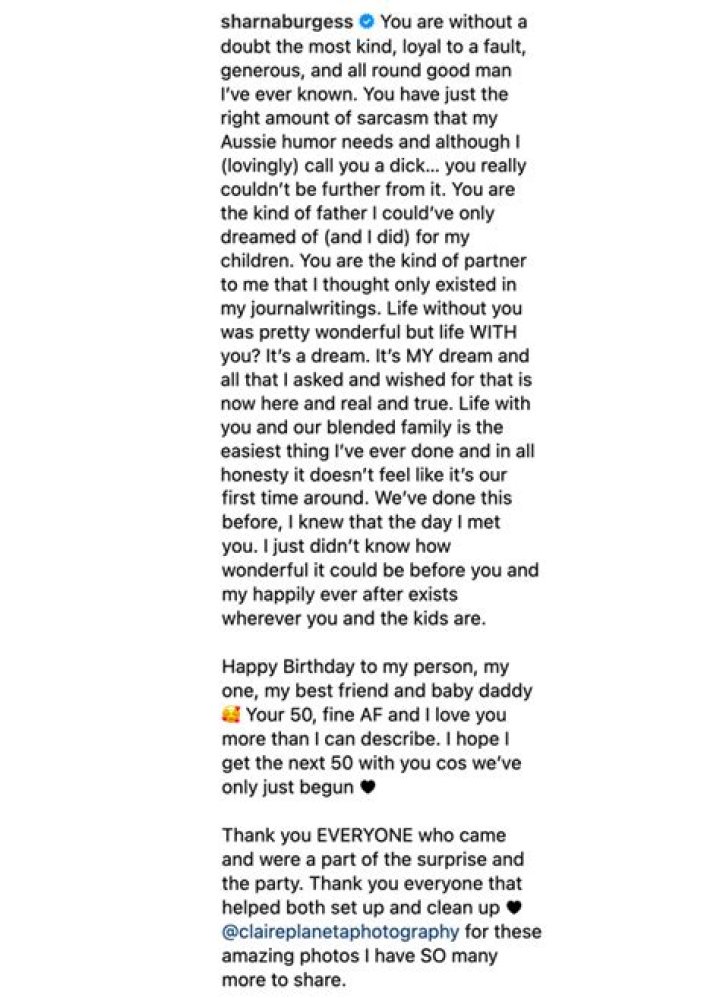 Aside from wishing him a happy birthday, Sharna highlighted Brian’s many positive qualities, and spoke about why she loves him so much. “You are without a doubt the most kind, loyal to a fault, generous, and all round good man I’ve ever known,” she wrote. “It’s MY dream and all that I asked and wished for that is now here and real and true.”